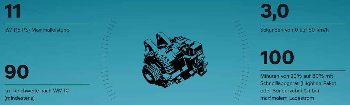- externes Ladegerät 1.500 W (Serie 900 W) für Haushaltssteckdose als Bestandteil der Sonderausstattung Highline sowie als Sonderzubehör (für 11 kW Version).