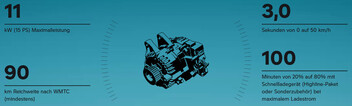 - Maximalleistung 11 kW (15 PS), Nennleistung 6 kW (8 PS), Drehmoment 55 Nm.
