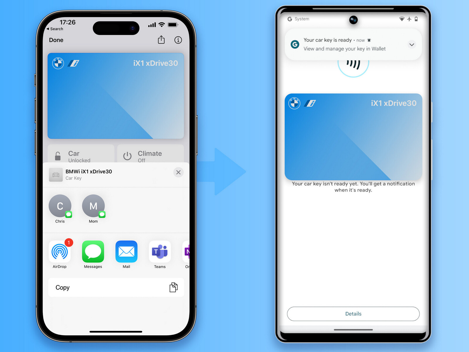 Diese jüngste Ausbaustufe sei das Ergebnis der engen Zusammenarbeit zwischen BMW und seinen Partnern Apple, Google und Samsung im Rahmen des Car Connectivity Consortium (CCC), so die Bayern in ihrer Meldung. Zunächst ist das plattformübergreifende Teilen der BMW-Autoschlüssel für Apple iPhones mit iOS 16.1 oder neuer sowie Google Pixel 7, Pixel 7 Pro, Pixel 6, Pixel 6 Pro (mit Android 13 oder neuer) verfügbar. Die entsprechenden Modelle von Samsung folgen in Kürze.