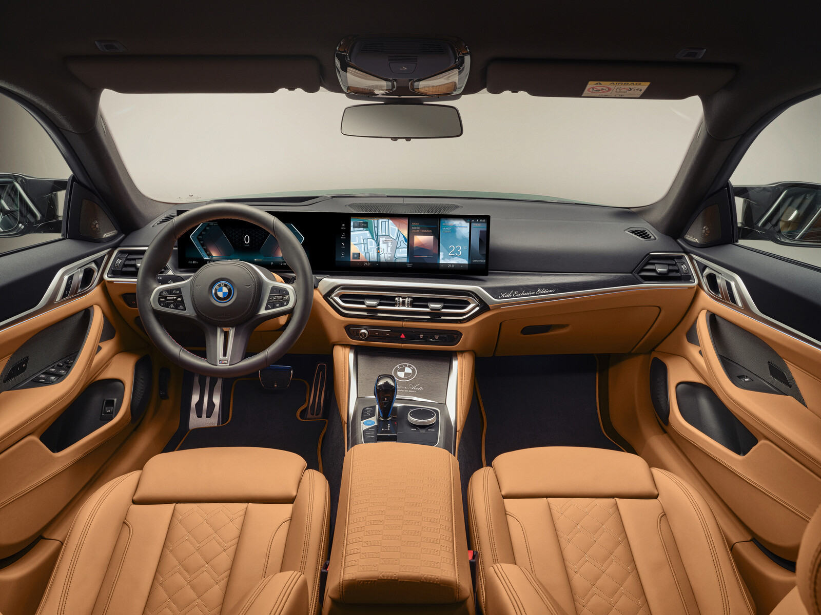 Auch der Innenraum des BMW i4 M50 Kith erhält ein Kith-Design in Caramel. Kniepolster, Lenksäule, Sitz- und Seitenverkleidung sowie A- und B-Säule unten sind mit feinem Merinoleder verkleidet. Ebenfalls mit caramelfarbenem Leder sind die Fußmatten vorne und hinten eingefasst und mit dem zu Kith veränderten M Logo sowie den M Streifen bestickt. Kith-Schriftzüge im Box-Design sind auf die Kopfstützen und auf die Mittelarmlehne vorne geprägt. Der Schriftzug "Kith Exclusive Edition" wurde in die Zierleisten lasergraviert.