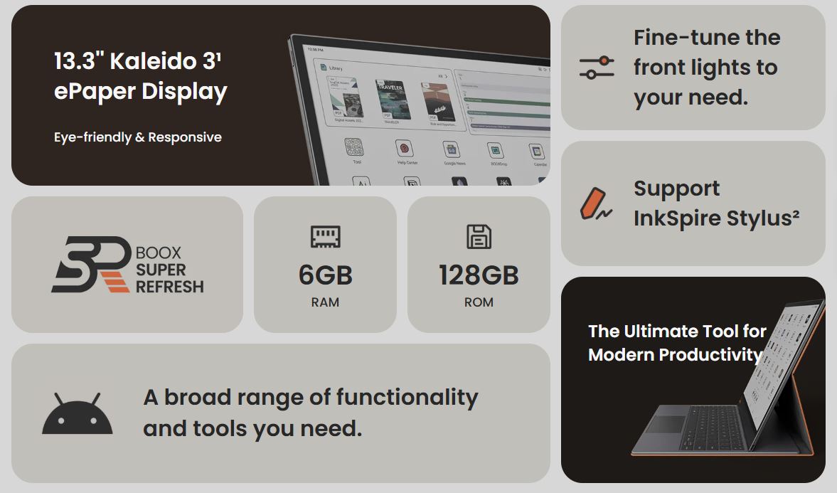 Verbaut ist ein 13,3 Zoll großes Kaleido 3-Display, welches 4.096 Pixeln darstellen kann, dann sinkt die Auflösung im Vergleich zur Schwarz-Weiß-Darstellung aber von 3.200 x 2.400 Pixeln auf 1.600 x 1.200 Pixeln. Verbaut ist ein SoC mit acht Rechenkernen, der Arbeitsspeicher ist 6 Gigabyte groß und der interne Speicher bietet eine Kapazität von 128 Gigabyte.