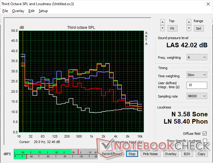 Die Lüftergeräusche bei höherer Last wie z. B. Spielen verursachen ein gleichmäßiges Lüftergeräusch von 42 dB(A). Das ist leiser als bei der GMK NucBox K6 und dem Beelink SER7, die alle mit der gleichen Ryzen 7 7840HS CPU ausgestattet sind. Wir finden das Lüftergeräusch nicht laut genug, um es als störend zu empfinden, vor allem, da die Nutzer eher weiter von ihren Mini-PCs entfernt sitzen als von ihren Laptops.