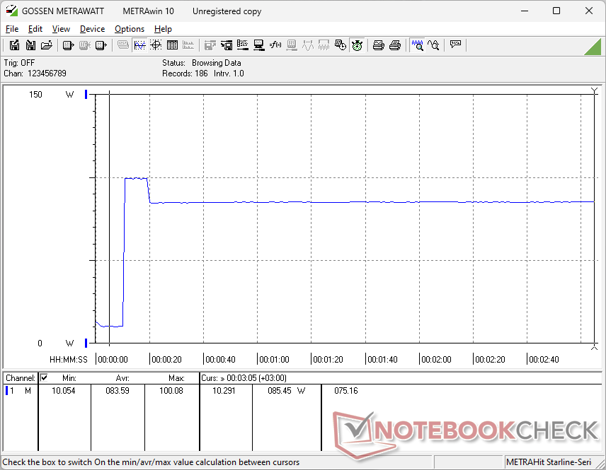 Wir konnten eine maximale Leistungsaufnahme von 99 W aus dem mittelgroßen (~13,9 x 6,3 x 3,5 cm) 120-W-Netzteil aufzeichnen, wenn die CPU zu 100 Prozent ausgelastet ist. Der Overhead kann beim Anschluss externer USB-Geräte oder Laufwerke nützlich sein.