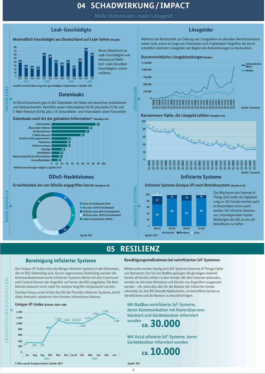 Professionell organisierte Erpressergruppen, die Ransomware (Erpressungs-Schadsoftware) einsetzen, bleiben laut PM die größte Bedrohung - auch wenn die Zahl der gemeldeten Cybercrime-Fälle insgesamt um neun Prozent zurückging. Die Taktik der Angreifer hat sich jedoch geändert: Wie der Tiefenscan zeigt, ist die Gesamtsumme der gezahlten Lösegelder gesunken. Der Grund: Die Angreifer zielen mit geringerem Aufwand auf die Masse der schwach geschützten KMUs und fordern dort geringere Einzelsummen, statt sich aufwändig an Großkonzernen abzuarbeiten. Das BKA registrierte 950 Ransomware-Angriffe. Das BSI warnt zudem: Selbst wer Backups hat, ist nicht sicher. Diese helfen zwar gegen die Daten-Verschlüsselung, aber nicht gegen die zweite Erpressungs-Stufe: die Drohung mit der Veröffentlichung der gestohlenen Daten (Datenleaks).