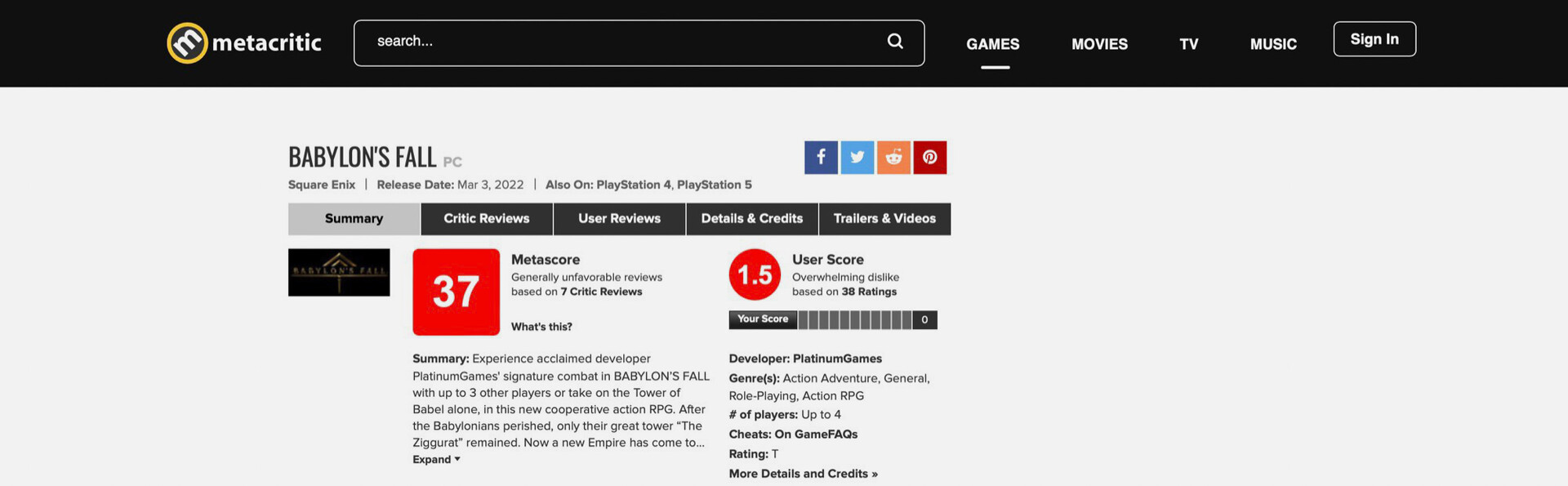 Platinum Games ist vor allem für die hervorragende Bayonetta-Serie und für Nier: Automata bekannt, mit Astral Chain und The Wonderful 101 hat das Entwickler-Studio aber auch einige innovative Spiele veröffentlicht, die meist ausgesprochen gute Kritiker-Wertungen erhalten konnten. Dass Babylon's Fall eine Metascore von nur 37 aus 100 möglichen Punkten erhalten hat ist daher umso überraschender.