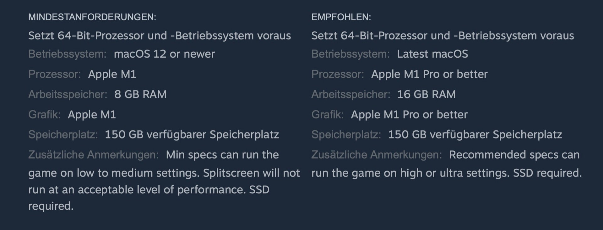 Da Apple viele Macs nach wie vor mit einer nur 256 GB fassenden SSD ausstattet, könnte der Speicherbedarf für einige Mac-Nutzer das größere Problem werden – Baldur's Gate 3 belegt rund 150 GB auf der SSD. Eine SSD ist in jedem Fall eine Grundvoraussetzung, um Baldur's Gate 3 zu spielen. Wer hohe Grafikeinstellungen und die native Auflösung eines MacBook-Displays nutzen möchte, benötigt mindestens einen Apple M1 Pro mit 16 GB RAM, wobei die Entwickler die Nutzung von AMD FSR empfehlen, um die Performance zu verbessern.