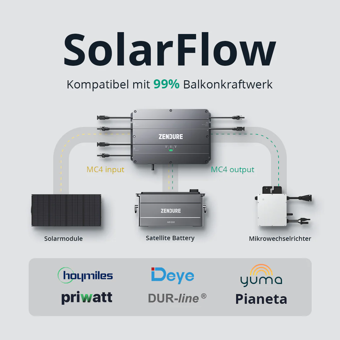 Den ersten Details zufolge handelt es sich bei Zendure SolarFlow wohl nicht um ein komplettes Balkonsolarkraftwerk, sondern um ein Zwischenmodul. Dieses soll mit 99 Prozent der Modelle auf dem Markt kompatibel sein. Zendure nennt unter anderem Hersteller wie Hoymiles, Deye, Yuma, Priwatt, DUR-Line und Pianeta.