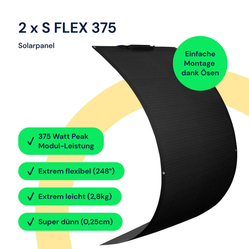 Um das hier angebotene Balkonkraftwerk am Balkongeländer zu installieren, benötigt man entweder eine Außensteckdose oder Fensterdurchführungskabel, also sehr flache Kabel, die ohne bauliche Veränderungen am Fenster durchgeführt werden können. Zum Lieferumfang gehören zwei leichte und flexible Module mit je 375 Wp in komplett schwarzer Ausführung. Die Solarpaneele haben einen Modulwirkungsgrad von 20,54 Prozent, wiegen nur 2,8 Kilogramm und sind gerade einmal 0,25 Zentimeter dick, sodass sie bequem mit einer Hand gehalten werden können.