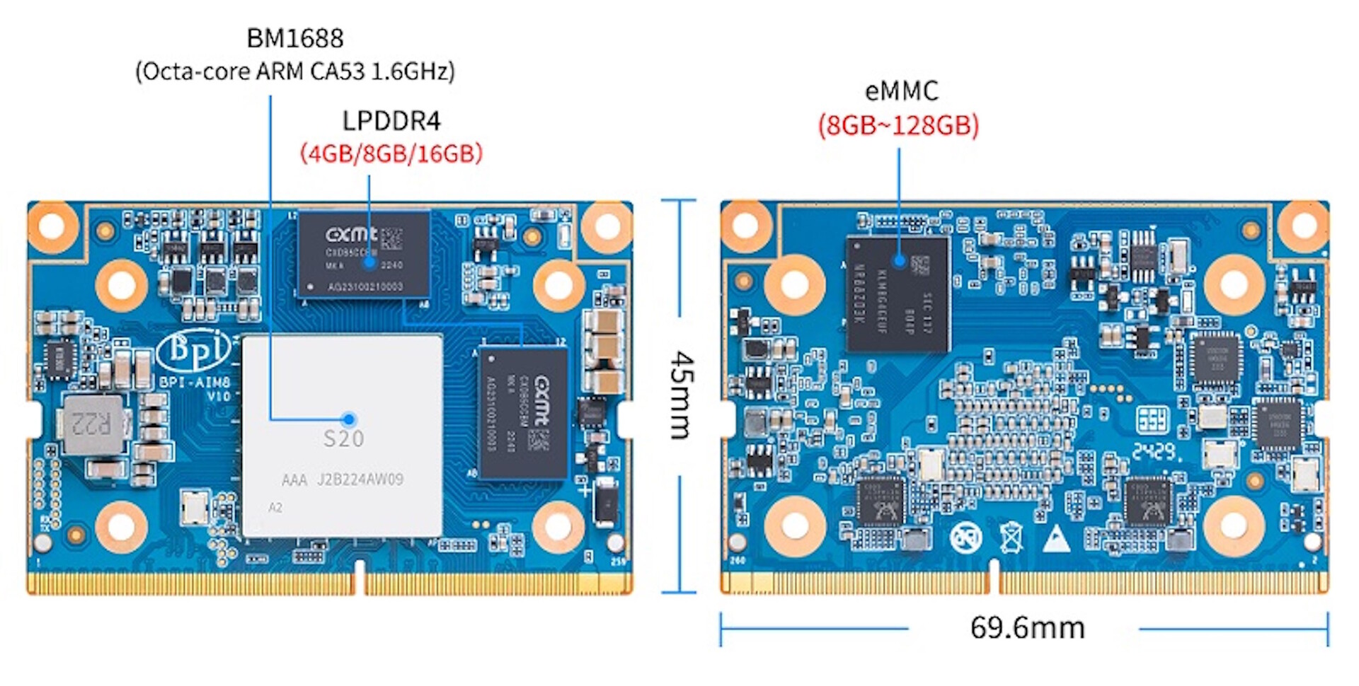 Das Compute Module ist mit einem Sophgo BM1688-SBC ausgestattet, wobei dieser nicht nur acht Cortex-A53-Rechenkerne mit einer Taktfrequenz von 1,6 GHz ausgestattet ist. Zudem wird eine INT8-Performance von 16 TOPS beworben, damit ließen sich (trainierte) KI-Modelle beispielsweise zur Bilderkennung auch lokal und direkt auf dem Gerät ausführen, was je nach Anwendungsfall sehr vorteilhaft oder gar schlicht notwendig sein kann. TensorFlow wird beispielsweise unterstützt.