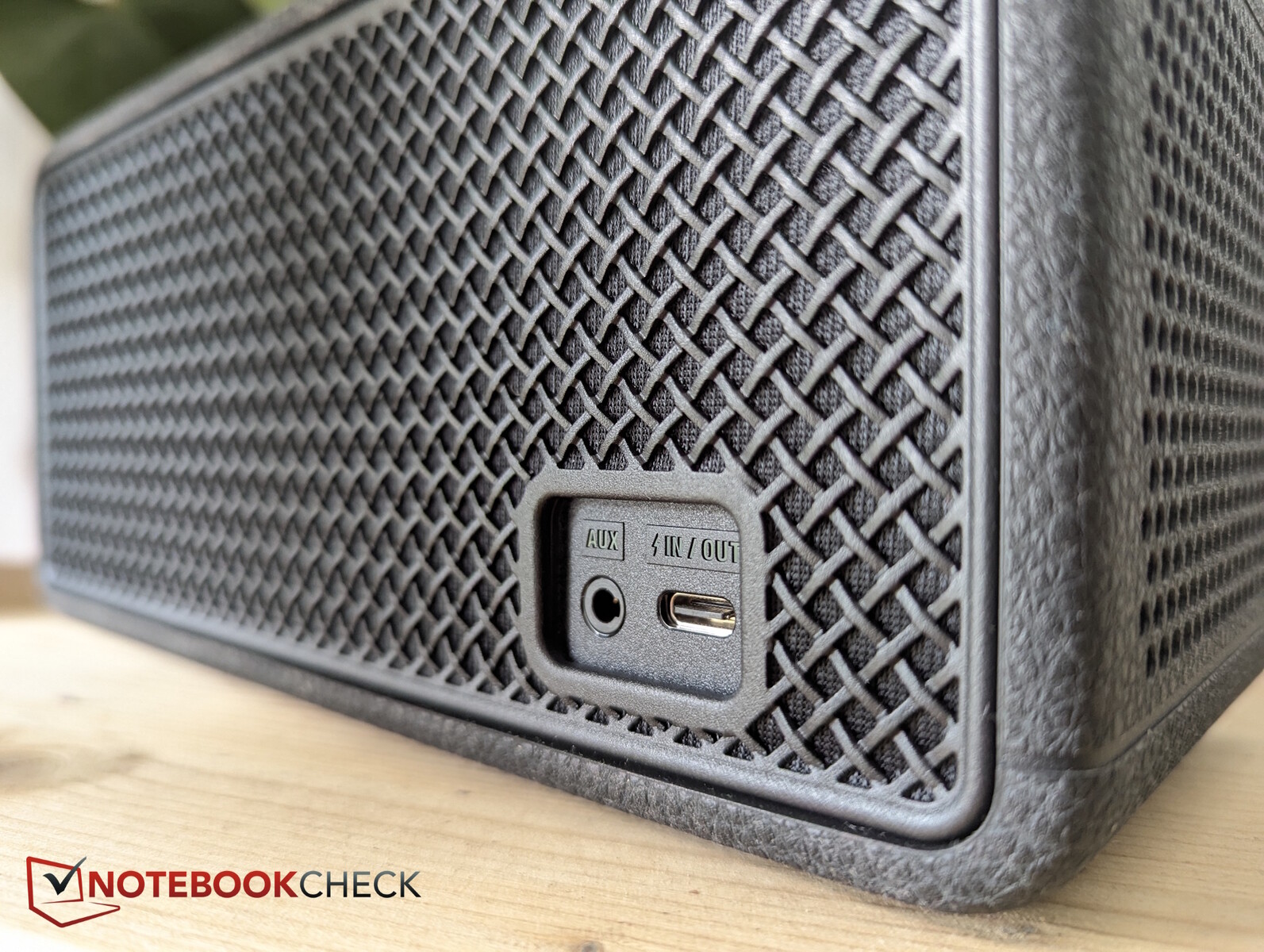 An der Hinterseite befinden sich unten die beiden Ports, nämlich der 3,5-mm-Klinkeneingang für analoge Zuspieler sowie der USB-C zum Laden und für die Powerbank-Funktion. Der AKku lässt sich in 3 Stunden komplett wieder aufladen, 20 Minuten Ladezeit ergeben 5 Stunden Spieldauer.