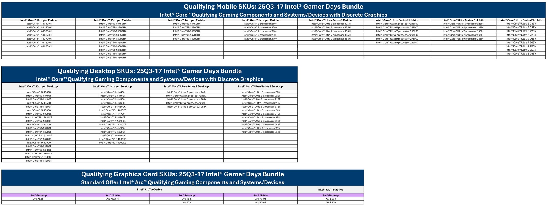 Laut Intel hätte dieses Software-Paket einen Gegenwert von 194,98 US-Dollar. Der Download-Code für Battlefield 6 soll ab dem 3. Oktober an Teilnehmer der Aktion versendet werden. Vor dem Kauf sollte unbedingt abgewartet werden, bis die Liste der teilnehmenden Händler in Deutschland und Österreich bestätigt wird, diese ist den Teilnahmebedingungen nämlich nicht zu entnehmen. Die Liste der Produkte, die für diese Aktion berechtigt sind, ist im unten eingebetteten Bild zu sehen.