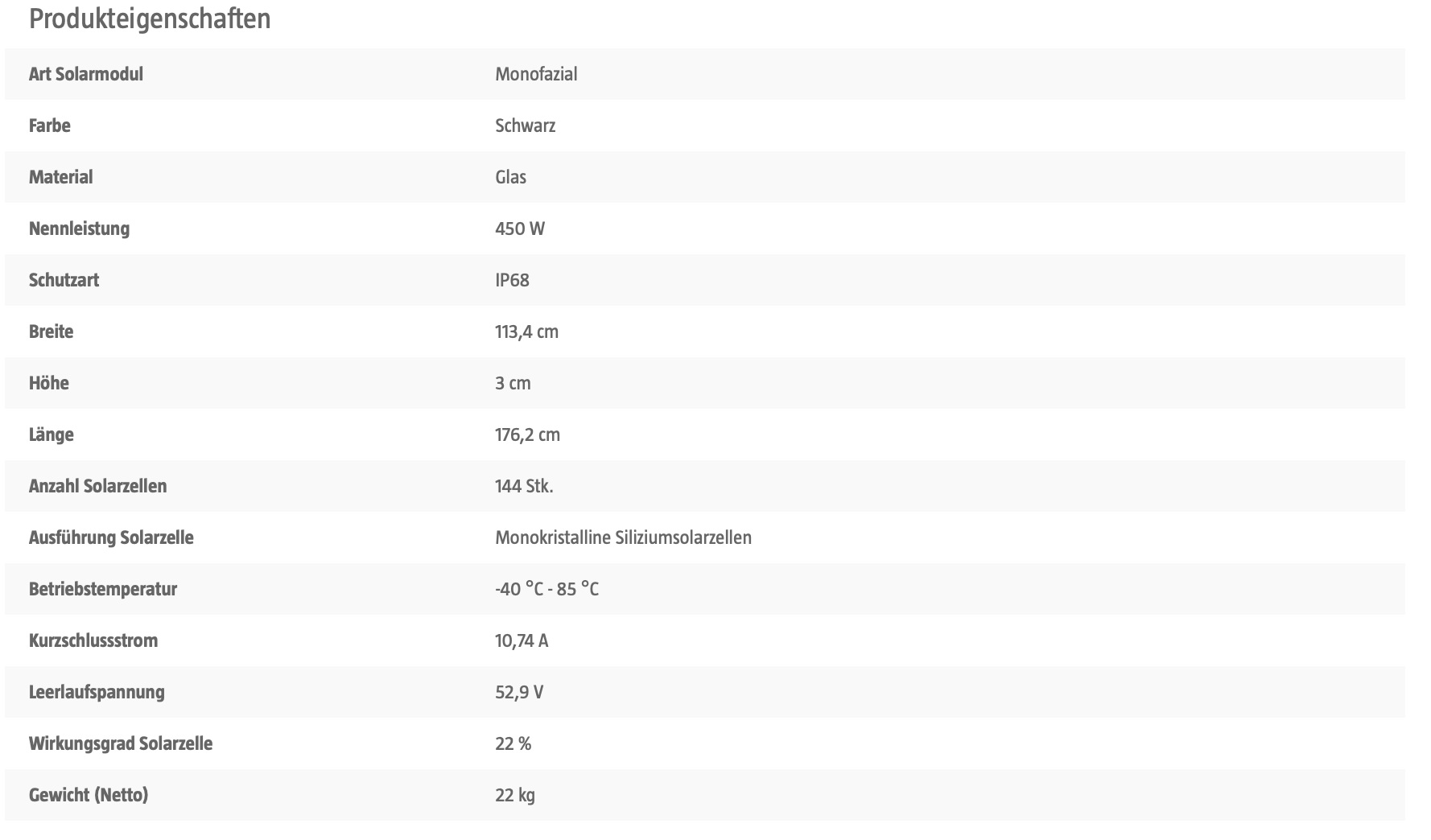 Unter optimalen Bedingungen erreicht das Solarmodul eine Leistung von bis zu 450 Wp mit einem Wirkungsgrad von 22,5 %. Zudem ermöglicht Multi-Busbar-Technologie einen effizienteren Lichteinfang, reduziert den Serienwiderstand und verbessert die Stromabnahme.