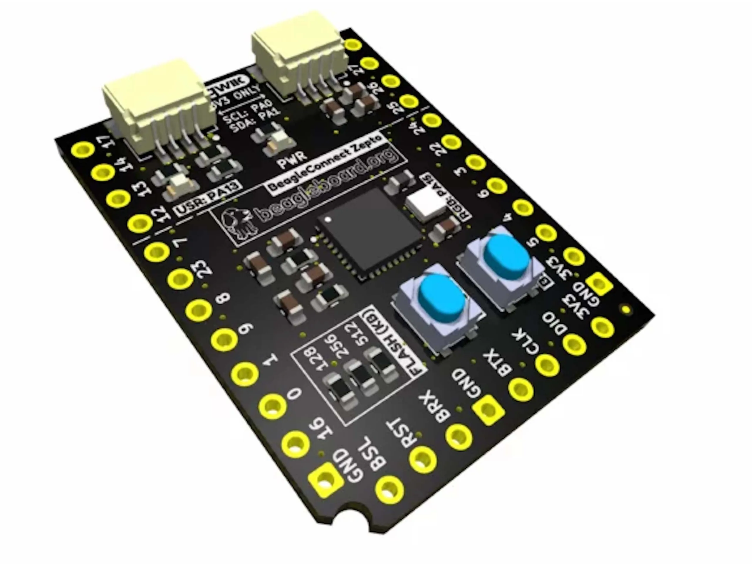 Genutzt wird der mikroBUS-Standard, was sich zum einen auch positiv auf den Preis auswirkt, da für die Nutzung dieses Standards keine Lizenzkosten zu entrichten sind. Zudem lassen sich allerdings auch entsprechende Erweiterungsplatinen nutzen. Zudem sind zwei QWIIC-Anschlüsse vorhanden. Diese erlauben die Anbindung entweder von weiteren Sensoren und Aktoren. Allerdings lässt sich der BeagleConnect Zepto auch selbst über QWIIC ansprechen und kann damit sozusagen als Erweiterungsplatine genutzt werden. Es handelt sich um eine offene Entwicklung, Interessierte sind ausdrücklich eingeladen, an dieser teilzunehmen.