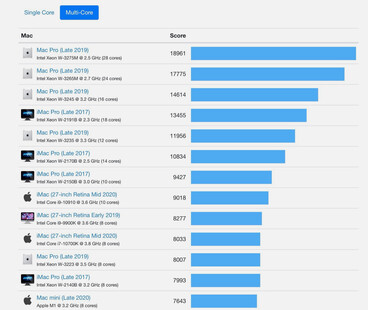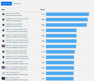 Wie Geekbench zeigt müssen sich Käufer eines neuen Mac auf Basis des M1 aber keine Sorgen darüber machen, dass ältere Software träge läuft: Mit einem Ergebnis von 1.313 Punkten bei Nutzung von einem Kern bzw. 5.888 Punkten beim Einsatz von allen Kernen können die eigenen Vorgänger mühelos übertroffen werden – selbst der Intel Core i7-1068NG7 im teuersten 13 Zoll MacBook Pro erreicht "nur" 1.240 respektive 4.514 Punkte, die Single-Core-Wertung übertrifft sogar sämtliche Intel-Macs.