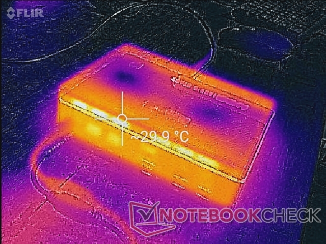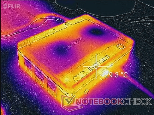 Die Oberflächentemperaturen stellen kein Problem dar, vor allem aus dem Grund, dass in die gesamte Oberseite des Gerätes eine Entlüftung integriert ist. Deshalb empfehlen wir, keine Papiere oder Bücher auf den Mini-PC zu legen. Bei vertikaler Ausrichtung sollte darauf geachtet werden, die Oberseite des Mini-PCs nicht gegen Wände oder Regale zu stellen, um die Belüftung weiterhin zu ermöglichen.