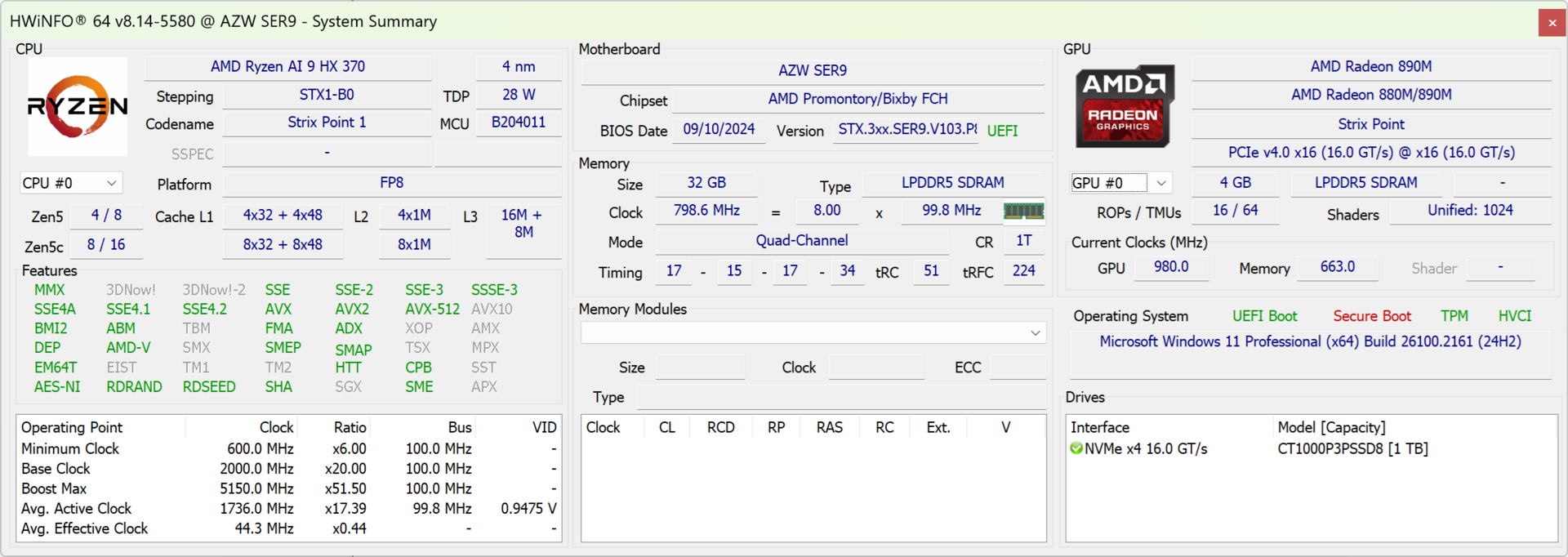 | Beelink SER9 AMD Ryzen AI 9 HX 370 ⎘ AMD Radeon 890M ⎘ 32 GB RAM, 1024 GB SSD | Amazon: 999,00 € Listenpreis: 1000 USD | 814 g | 44.7 mm | x | |