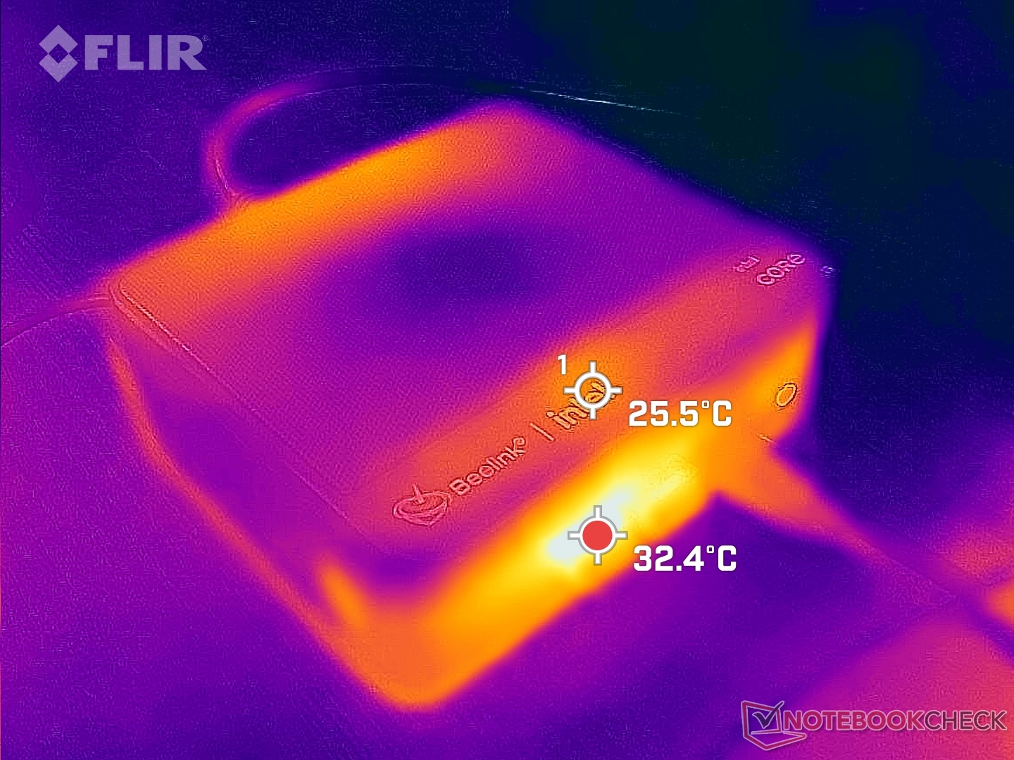 Von der Benutzung unabhängig ist der Lüfter im Gerät immer aktiv. Zum Glück ist er mit nur 24,7 dB(A) gegenüber einer Hintergrundlautstärke von 22,8 dB(A) relativ leise. Der Erwartung eines lautlosen Mini-PCs wird dieses Gerät allerdings nicht gerecht.