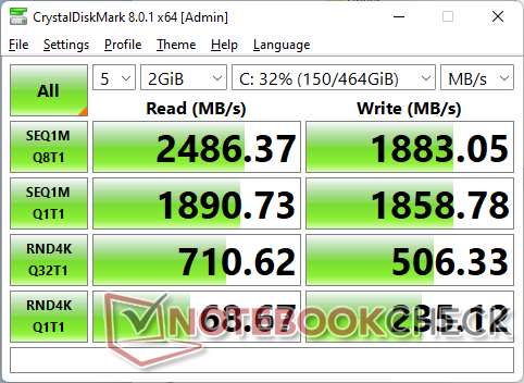 Das Gerät wird mit dem relativ neuen MediaTek RZ608 mit Wi-Fi 6E und Bluetooth 5.2 ausgeliefert. Leider ist das Modul weder so zuverlässig noch so schnell wie die üblichen Intel-AX-Lösungen. Wenn es mit unserem 6-GHz-Netzwerk verbunden ist, erreichen die Übertragungsraten nur ~750 Mbps, verglichen mit fast dem Doppelten eines Intel AX201 oder AX210. Außerdem hatte das System Probleme, unser 6-GHz-Netzwerk überhaupt zu erkennen.