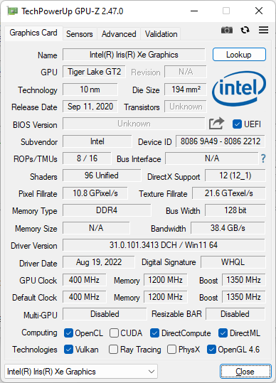| Durchschnittliche Intel Iris Xe Graphics G7 96EUs (8.15 - 27.8, n=178) | |