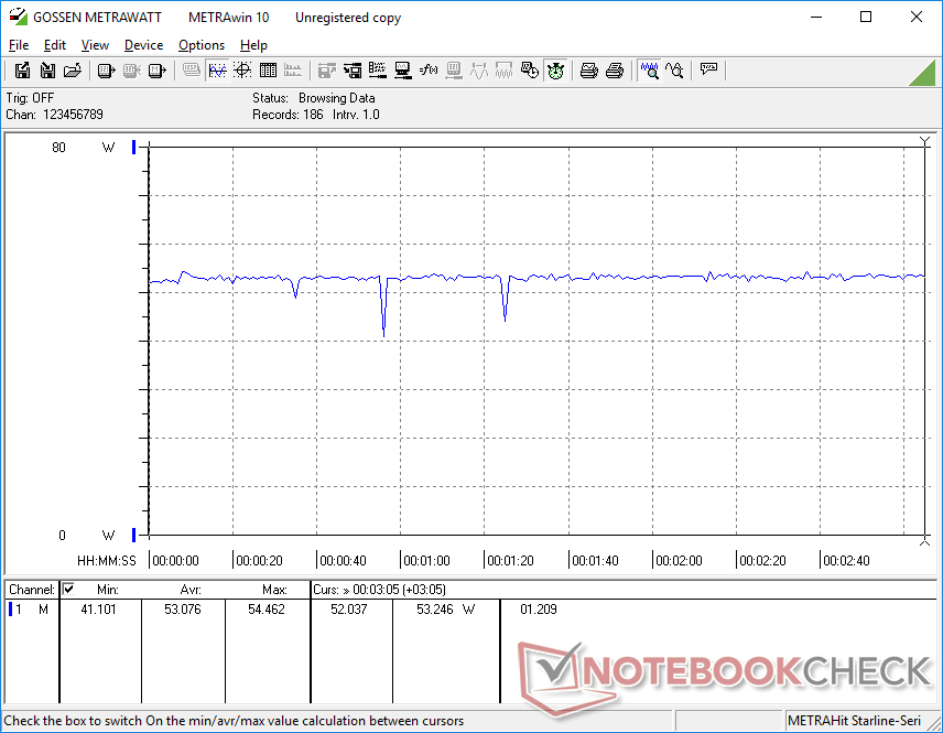 Wir konnten mit dem relativ kleinen (~10 x 4,3 x 4,8 cm) 57-Watt-Netzteil (19 V, 3 A) eine maximale Leistungsaufnahme von 59 W aufzeichnen, wenn Prime95 läuft.