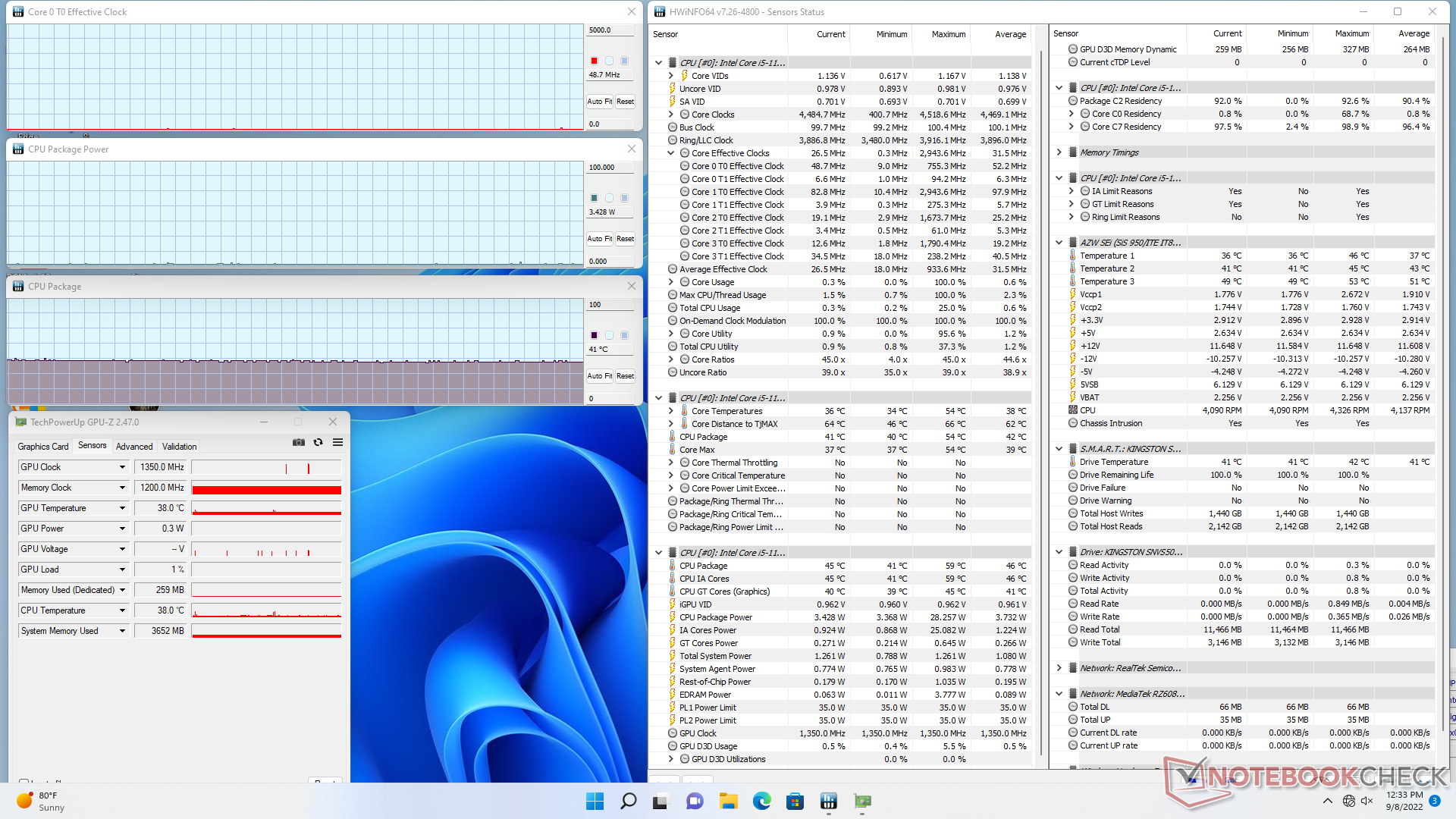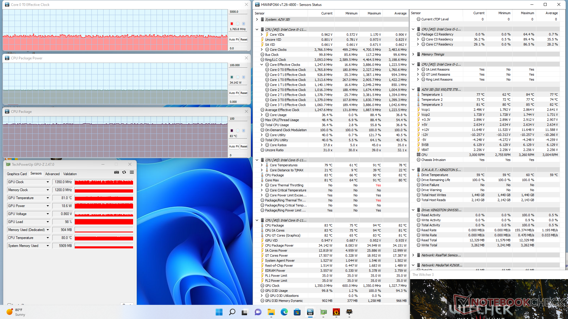 Die GPU-Taktraten und die Temperatur beim Betrieb von Witcher 3 sind relativ stabil bei 1.350 MHz bzw. 83 °C. Die Durchführung des gleichen Tests auf dem Intel NUC11 mit dem Core i5-1135G7 würde im Vergleich dazu zu einer viel kühleren Kerntemperatur von 58 °C führen.