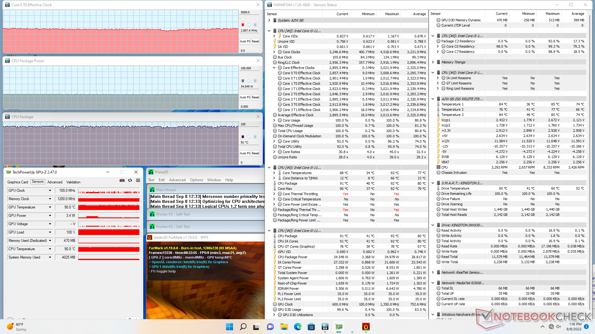 Die Taktraten und die Leistungsaufnahme des Boards steigen auf 2,9 GHz bzw. 35 W, wenn Prime95 läuft. Das System ist in der Lage, diese Werte unbegrenzt aufrechtzuerhalten, wenn auch bei einer relativ hohen Kerntemperatur von 90 °C. 35 W ist der obere TDP-Bereich für den Core i5-11320H, und somit nutzt der SEi11 den Prozessor nahe an seinem maximalen Potenzial aus.