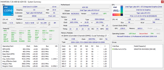 Die Core i5-11320H ist eine selten genutzte CPU, da die meisten anderen PCs mit Tiger-Lake-H-CPUs normalerweise den Core i5-11300H nutzen. Die Leistung des i5-11320H ist in jeder Hinsicht gleich. Auf dem Papier gibt es geringfügige Unterschiede in der Taktrate, die nach unseren Beobachtungen mit dem Beelink in den meisten Anwendungen keine Auswirkungen haben.