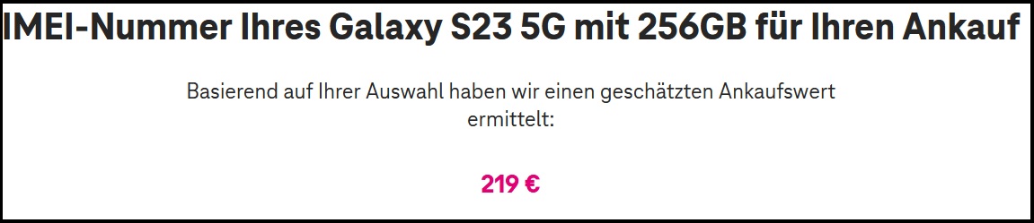 Für ein Samsung Galaxy S23 mit 256 GB Speicher bekommt man noch 219 Euro, durch die 150 Euro Ankaufsbonus sind das dann 369 Euro, bei einschlägigen Verkaufsportalen wie zoxs.de bekommt man für einen "Wie neu"-Zustand gerade mal 281 Euro.