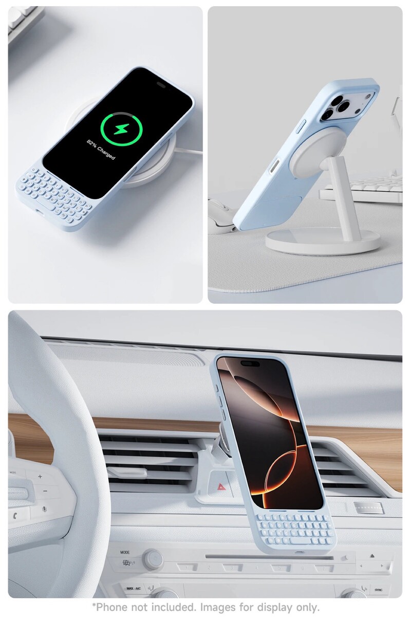 Akko MetaKey besitzt auch einen integrierten Magnetring, sodass auch MagSafe-Zubehör und drahtlose Ladegeräte verwendet werden können. Die Hülle wiegt regulär 79 Gramm, allerdings liefert Akko ein herausnehmbares Gewicht mit, welches das untere Drittel der Hülle 9 Gramm schwerer macht, wodurch das Gewicht auf die gesamte Fläche gleichmäßiger verteilt werden soll. Die Tastatur besitzt eine weiße Beleuchtung, die auf Knopfdruck aktiviert werden kann.
