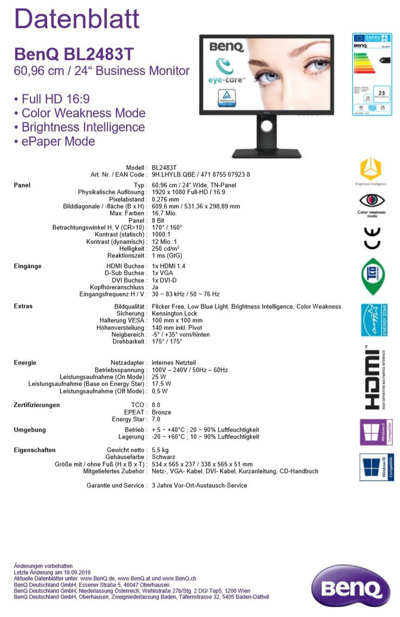 Für Anwender mit einer Farbfehlsichtigkeit im Bereich der Rot- und Grün-Wahrnehmung verfügt der BenQ BL2483T über den Color Weakness-Modus, der eine individuelle Anpassung von Rot- und Grüntönen an das Sehempfinden des Anwenders ermöglicht. Der Betrachter sieht das Bild in diesen Farbbereichen kontrastreicher und kann die Farbunterschiede besser erkennen. Der BenQ BL2483T ist TCO 8.0, EPEAT Bronze und Energy Star 7.0 zertifiziert.