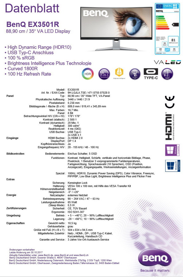 Zum Featureset des BenQ EX3501R zählen neben HDR10- auch FreeSync-Unterstützung und eine sRGB-Farbraumabdeckung von 100 Prozent. Als mögliche Betrachtungswinkel nennt BenQ für den EX3501R einen Bereich von 178 Grad horizontal und vertikal. Die Bildwiederholfrequenz des EX3501R beträgt bis zu 100 Hz, als Reaktionszeit nennt der Hersteller 4 Millisekunden (GtG). Über USB-C verwendet der EX3501R ein einziges Kabel für den Datentransfer und zur Bild-/Videoübertragung.