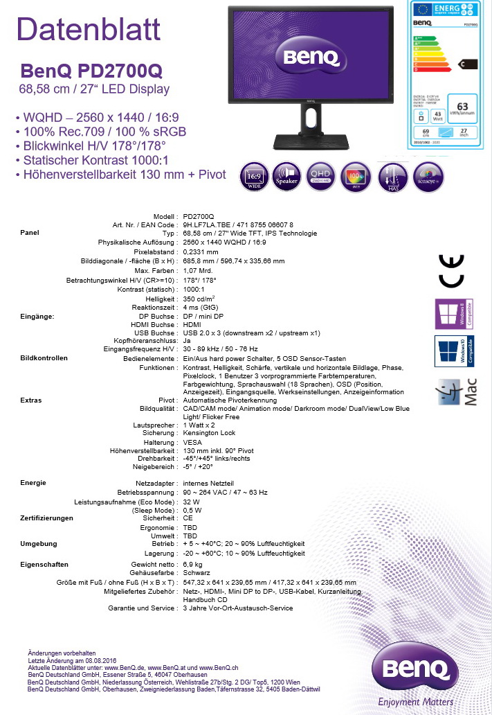 Abgerundet wird die Ausstattung des BenQ PD2700QFeature-Vielfalt durch zwei integrierte 1-Watt-Lautsprecher, drei USB-Anschlüsse, Display-Port-, Mini-DP-, Kopfhörer- sowie einen HDMI-Anschluss. BenQ gewährt für den PD2700Q drei Jahre Garantie inklusive Vor-Ort-Austausch-Service.