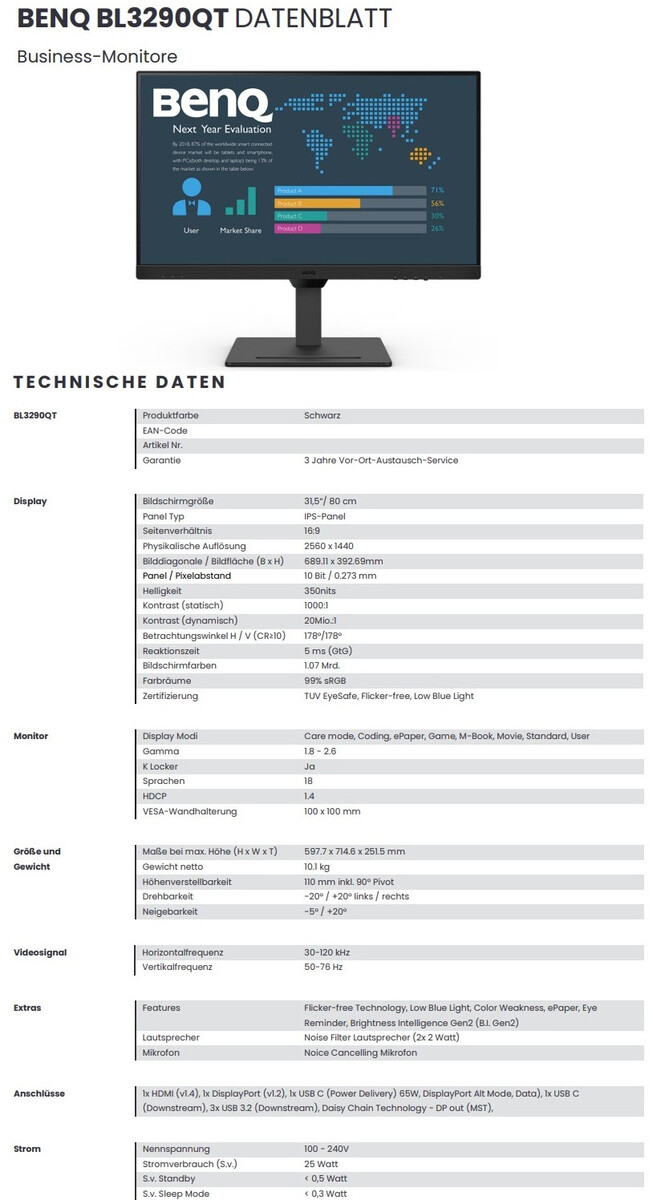 Mit ihren WQHD-Auflösungen (2.560 x 1.440 Pixeln) und 99-prozentiger sRGB Farbraumabdeckung bieten sie gestochen scharfe Darstellungen und beeindruckende Farbqualität. Integrierte Modi optimieren die Bildwiedergabe je nach Arbeitsanforderung. Dank Daisy Chaining eignen sich BL2790QT und BL3290QT außerdem für Multi-Monitor-Setups. Die schmalen Rahmen ermöglichen eine nahezu nahtlose Darstellung aller Inhalte. Zudem haben die Monitore integrierte Lautsprecher mit Noise-Cancelling-Technik für multimediale Arbeitsumgebungen an Bord.