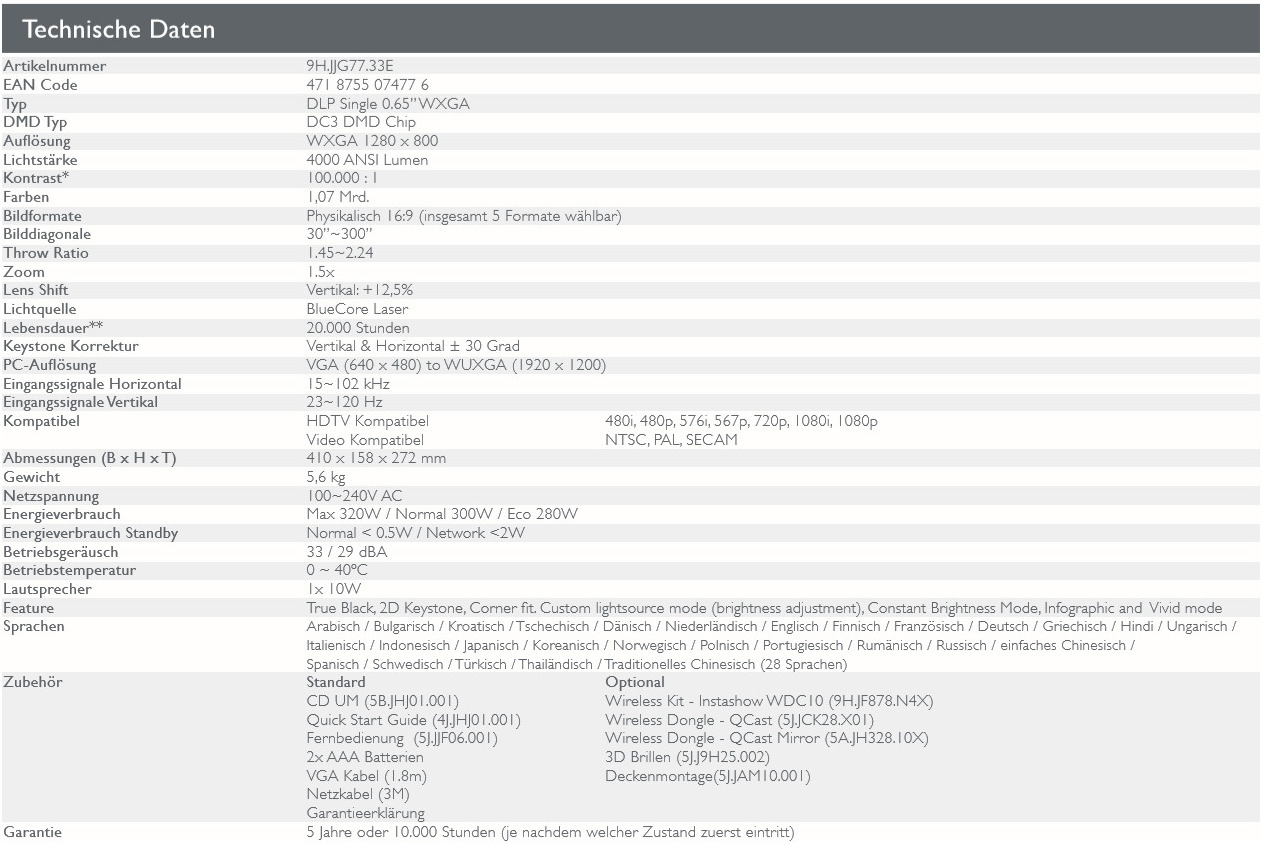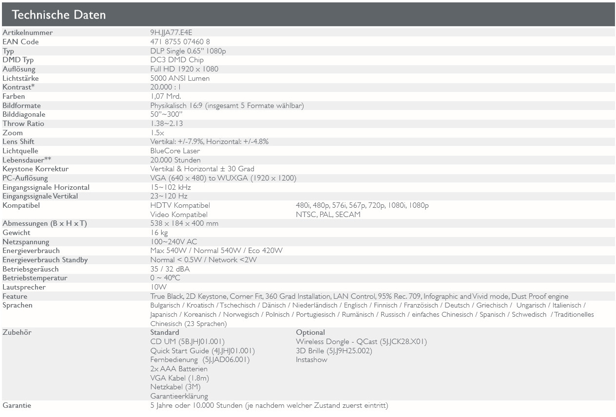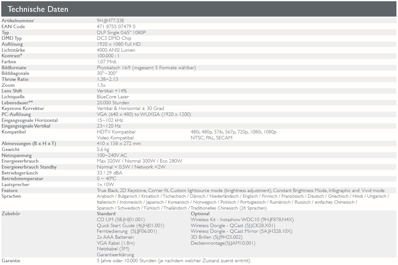 Die drei Neuzugänge sollen sich durch ein hohes Kontrastverhältnis von 100.000:1 (LH720 und LW720) respektive 20.000:1 (LH770) und besonders intensiven Schwarzwerten auszeichnen. Für LH720 und LW720 nennt BenQ eine Lichtstärke von 4.000 ANSI Lumen. Der stärkere LH770 liefert 5.000 Lumen. Der LW720 bietet eine WXGA-Auflösung von 1.280 x 800 Pixeln im 16:10- Format, LH720 und LH770 hingegen Full HD mit 1.920 x 1.080 Pixeln (16:9).