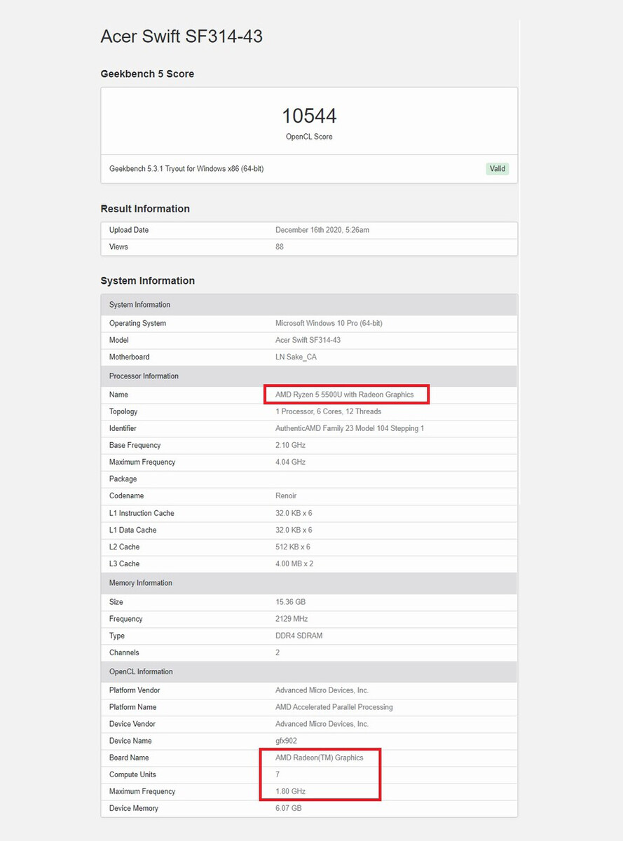Die Taktfrequenzen steigen um beachtliche 20 Prozent von 1,5 GHZ auf 1,8 GHz. Ein neues Geekbench OpenCL-Ergebnis zeigt nun die Performance dieses neuen Grafikchips. Das Ergebnis von 10.544 Punkten kann sich dabei durchaus sehen lassen, laut der Geekbench-Datenbank konnte die ältere Vega 6 im Schnitt gerade einmal 6.998 Punkte erzielen, die Wertung liegt auf Augenhöhe mit einer Nvidia GeForce GTX 860M.