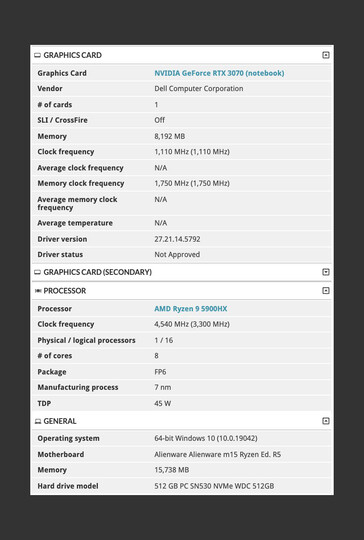 Alienware stattet seine aktuellen Laptops allesamt mit Intel Comet Lake-Prozessoren aus, in den Topmodellen kommt stets der Core i9-10980HK mit seinen acht Kernen und Taktfrequenzen von bis zu 5,3 GHz zum Einsatz. Das könnte sich schon bald ändern, denn die unten eingebetteten 3DMark-Einträge zeigen laut dem bekannten Leaker @_rogame das Alienware m15 R5 Ryzen Edition.