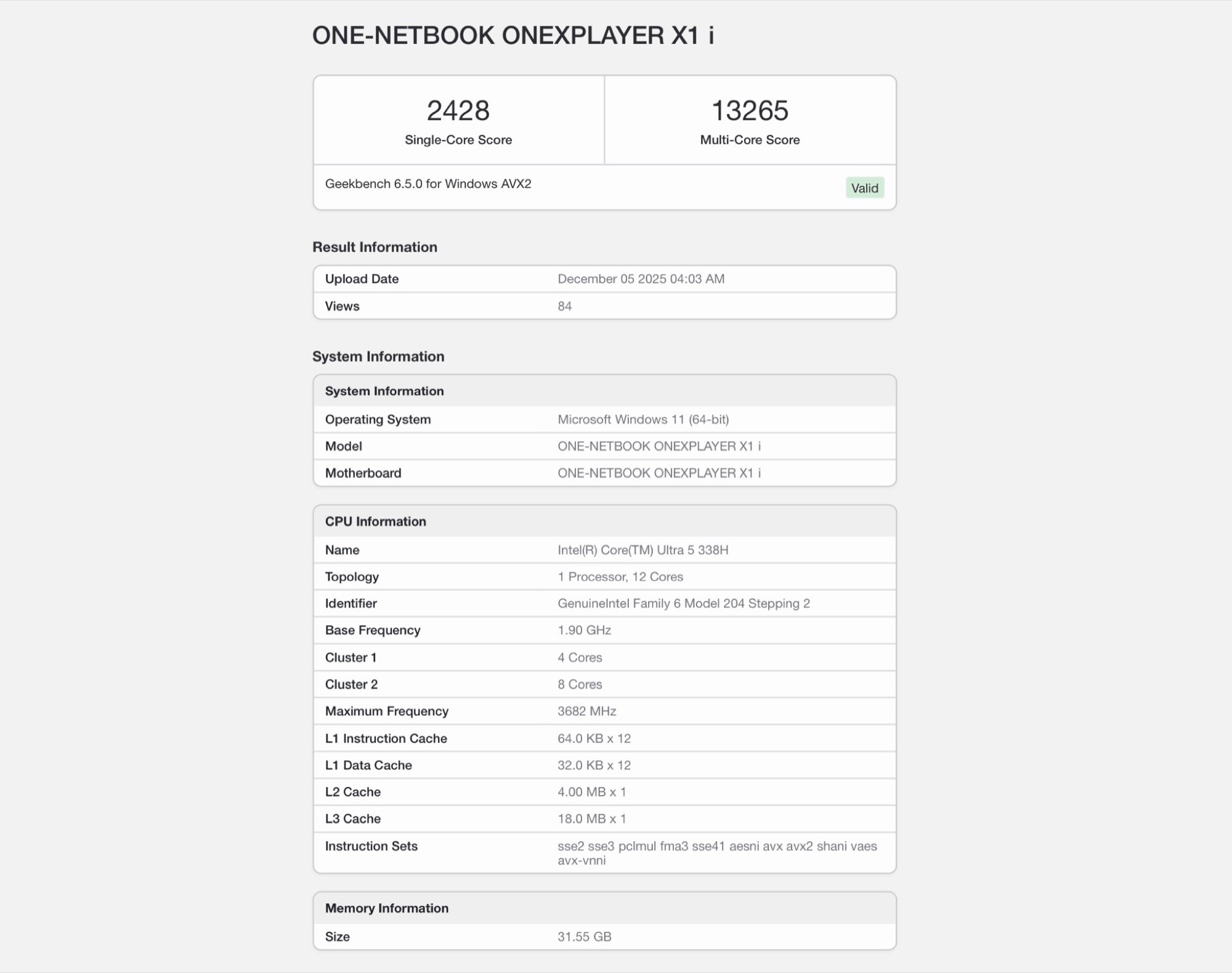 Demnach setzt OneXPlayer auf den Intel Core Ultra 5 338H, der vier Performance-Kerne, acht Effizienz-Kerne und die integrierte Intel Arc B370 iGPU besitzt. Mit einem Geekbench 6 Resultat von 2.428 Punkten bei der Nutzung eines Kerns und 13.265 Punkten mit allen zwölf Kernen wäre der Chip nur unwesentlich schneller als der Intel Core Ultra 5 225H, allerdings zeigen derart frühe Benchmarks häufig nicht die finale Leistung eines Prozessors. Der OneXPlayer X1 der nächsten Generation besitzt offenbar 32 GB Arbeitsspeicher.