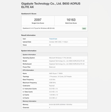 Details zur TDP sind noch nicht verfügbar, der Chip erreicht laut der Angaben auf Geekbench aber einen Basistakt von 4,5 GHz und Boost-Taktfrequenzen bis 5,4 GHz, womit die Taktraten identisch mit dem Ryzen 7 7700X sind. Das Single-Core-Benchmark-Ergebnis von 2.097 Punkten fällt demnach praktisch identisch aus, werden alle zehn Kerne genutzt, so erreicht der Ryzen 7 7800X aber 16.163 Punkte, womit der Chip 11,8 Prozent schneller als der Ryzen 7 7700X ist. Dass die Mehrleistung trotz 25 Prozent zusätzlicher Kerne nur 11,8 Prozent beträgt, könnte an noch fehlenden Optimierungen oder an einer mangelhaften Kühlung des Testsystems liegen.