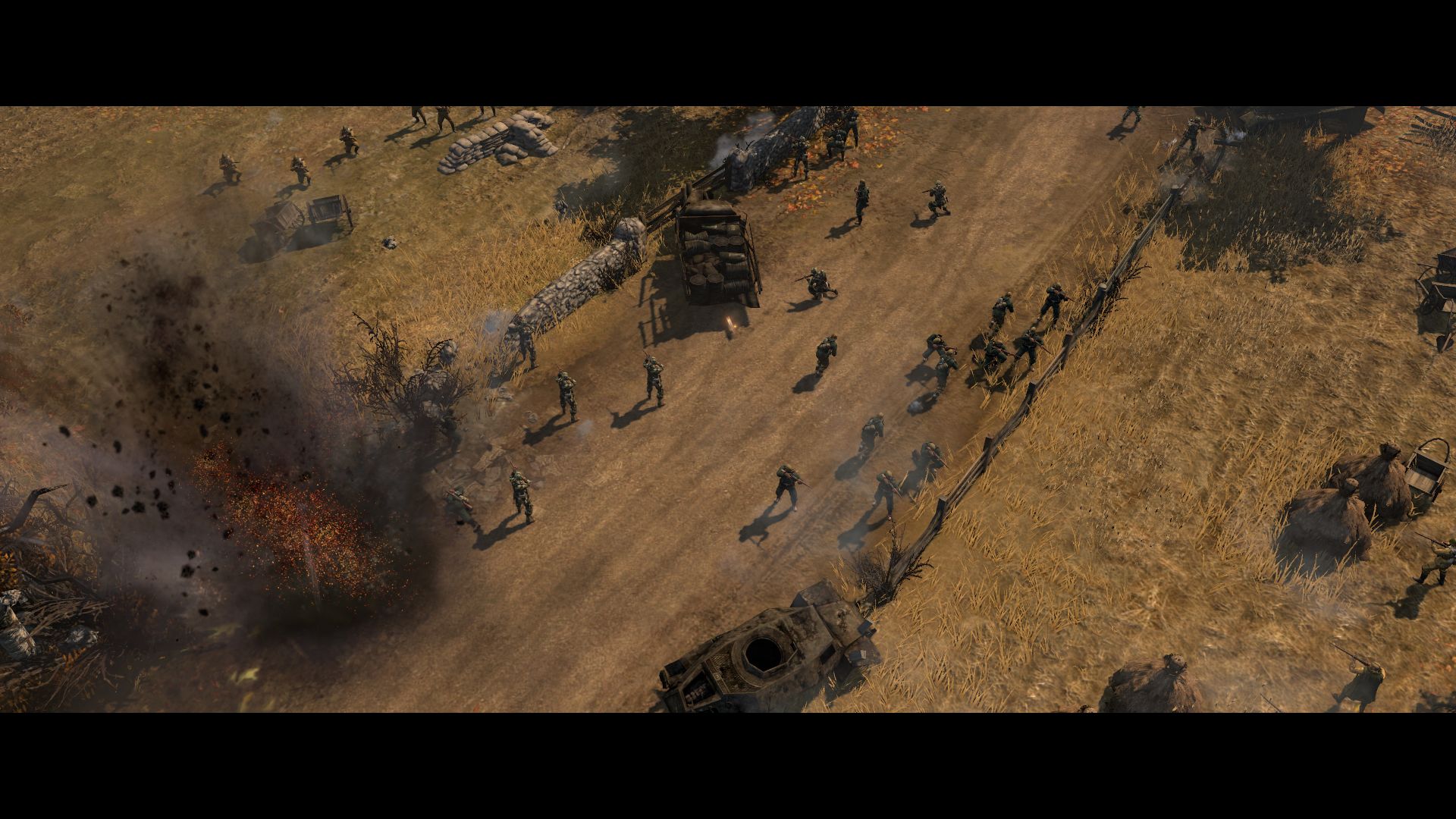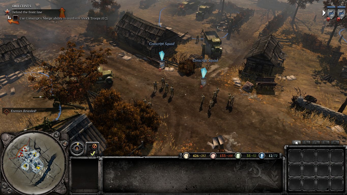 Wie es sich für einen guten RTS-Titel gehört, regiert ein knallhartes Stein-Schere-Papier-Prinzip. Beispiel: 08/15-Soldaten, die nicht in Granaten- oder Molotov-Cocktail-Reichweite sind, werden von einem MG-Nest in Sekundenschnelle zerpflückt. Verschanzte Einheiten müssen sich dagegen vor Ingenieuren hüten, die mit einem Flammenwerfer ausgestattet sind. Eine besonders wichtige Rolle nimmt das Deckungssystem ein, das zum Flankieren einlädt. Über verschiedenfarbige Punkte und Anzeigen wird die Qualität einer Deckung symbolisiert.