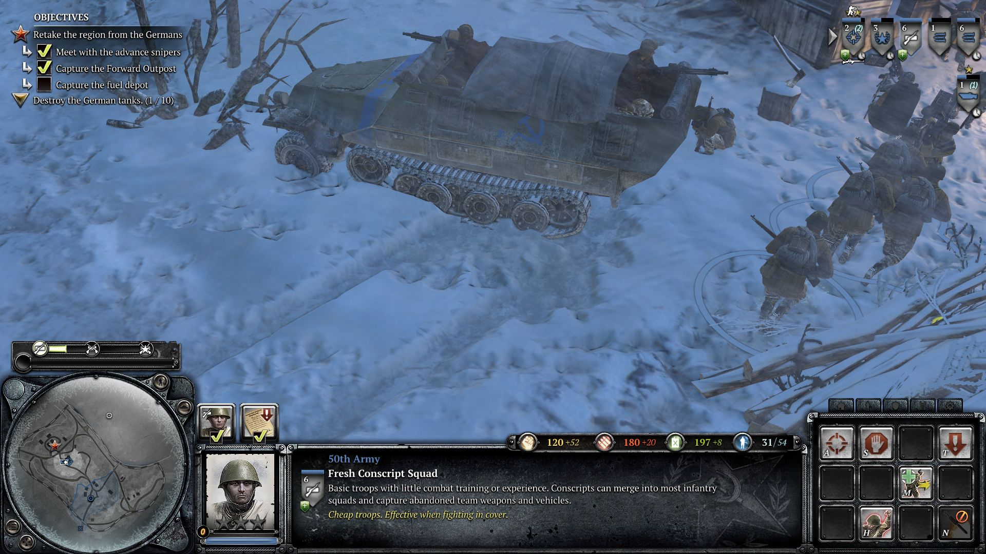 Wer jetzt ein hirnloses Action-Spektakel befürchtet, kann allerdings aufatmen. Im Kern ist Company of Heroes 2 überraschend taktisch und anspruchsvoll. Während wir bei vielen Konkurrenzprodukten munter einen Panzer nach dem anderen ausheben und damit früher oder später den Gegner überrollen, sollte man in Company of Heroes 2 auf jede einzelne Einheit achten. Zwar sind die Russen für ihre Kanonenfutter-Taktik berüchtigt (Masse statt Klasse), blindlings nach vorne zu preschen entpuppt sich jedoch häufig als Fehler.