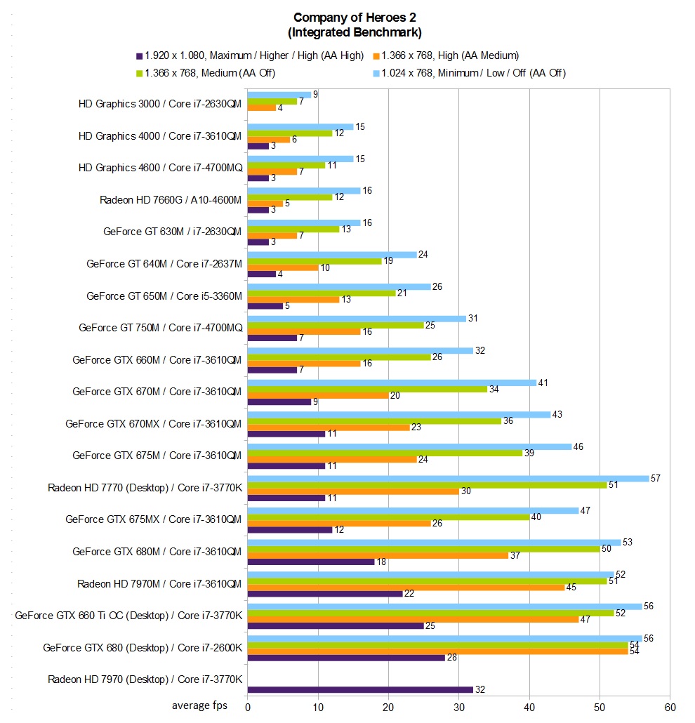 Wie schon angedeutet, beansprucht Company of Heroes 2 die Hardware sehr stark. Während bei Desktop-Systemen mitunter der Prozessor limitiert, hängt die Leistung im Notebook-Bereich primär von der Grafikkarte ab. Intels Prozessor-Chips stoßen auch mit niedrigen Optionen an ihre Grenzen. Selbst die brandneue Haswell Variante HD Graphics 4600 kommt im integrierten Benchmark nicht über einen Durchschnittswert von 15 fps. Auch Besitzer einer älteren Midrange-GPU wie der GeForce GT 630M dürften mit Company of Heroes 2 nicht glücklich werden (außer sie reduzieren die Gameplay Resolution).
