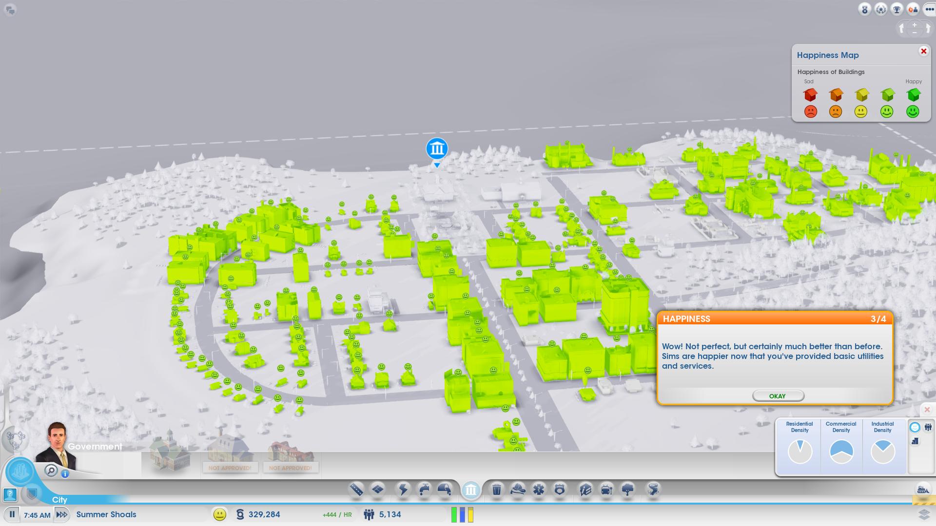 Was nicht bedeutet, dass der Städtebau von selbst läuft und Experten keine Herausforderungen und umfangreiche Möglichkeiten an die Hand bekommen. Die zahllosen Statistiken und Sichtfilter, die sich in den verschiedenen Menüs tummeln, gewähren auf Wunsch einen tiefen Einblick in die zugrunde liegende Mechanik. Maxis schafft hier einen tollen Spagat zwischen Zugänglichkeit und Breite. Je größer die eigene Stadt wird, umso höher werden natürlich die Ansprüche und Bedürfnisse der Bürger. Während sie sich anfangs noch mit Strom, Wasser und einer intakten Müllentsorgung zufrieden geben, muss bald auch eine Schule, eine Polizeistation und ein Krankenhaus her.