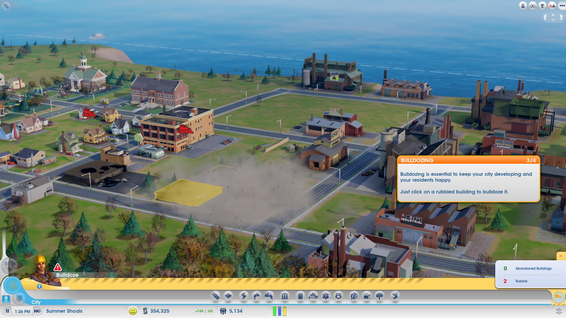 Starten wir am besten mit ein paar generellen Eindrücken. Nach dem stimmungsvollen und nett gemachten Intro-Video bietet uns das Spiel ein kleines Tutorial an. Dort lernen wir die wichtigsten Grundlagen von SimCity kennen. Besonders gut hat uns dabei die simple und für Einsteiger leicht durchschaubare Einteilung in drei Gebietskategorien gefallen. An passenden Straßenzügen legen wir blitzschnell Wohnviertel (grün), Gewerbeareale (blau) oder Industrieflächen (gelb) an. Die einzelnen Gebäude werden dann automatisch vom Spiel gebaut.