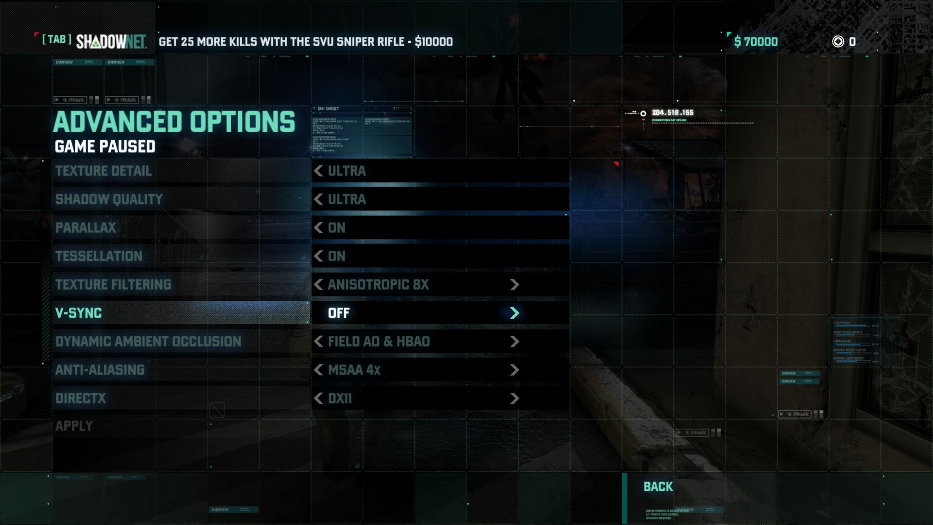 Da hätten wir unter anderem Tessellation, Parallex Mapping und Ambient Occlusion (Field AO, SSAO & HBAO). Hinzu gesellen sich die Kantenglättungsmodi FXAA, MSAA, SSAA sowie das Nvidia exklusive TXAA. Ansonsten enthält das erweiterte Grafikmenü noch Regler für die Texturschärfe, die Schattenqualität, die Texturfilterung und die vertikale Synchronisation. Mit Ausnahme der DirectX Option werden jegliche Änderungen direkt übernommen, wobei man den Spielstand teils neu laden muss.