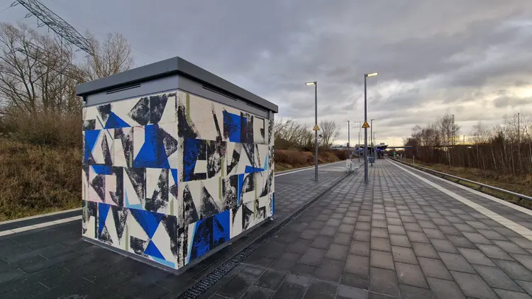 Es gibt aber einen Teil, der tatsächlich meist nur zum Zukunftsbahnhof gehört: "Das gestaltete Trafohaus am Ende des Bahnhofes bietet zudem ein optisches Highlight, das den Bahnhof unverwechselbar macht." Die Deutsche Bahn will auf Zukunftsbahnhöfen mit mehr Farbe arbeiten. Dazu passt das Trafohaus. Ob das allerdings ein optisches Highlight ist?