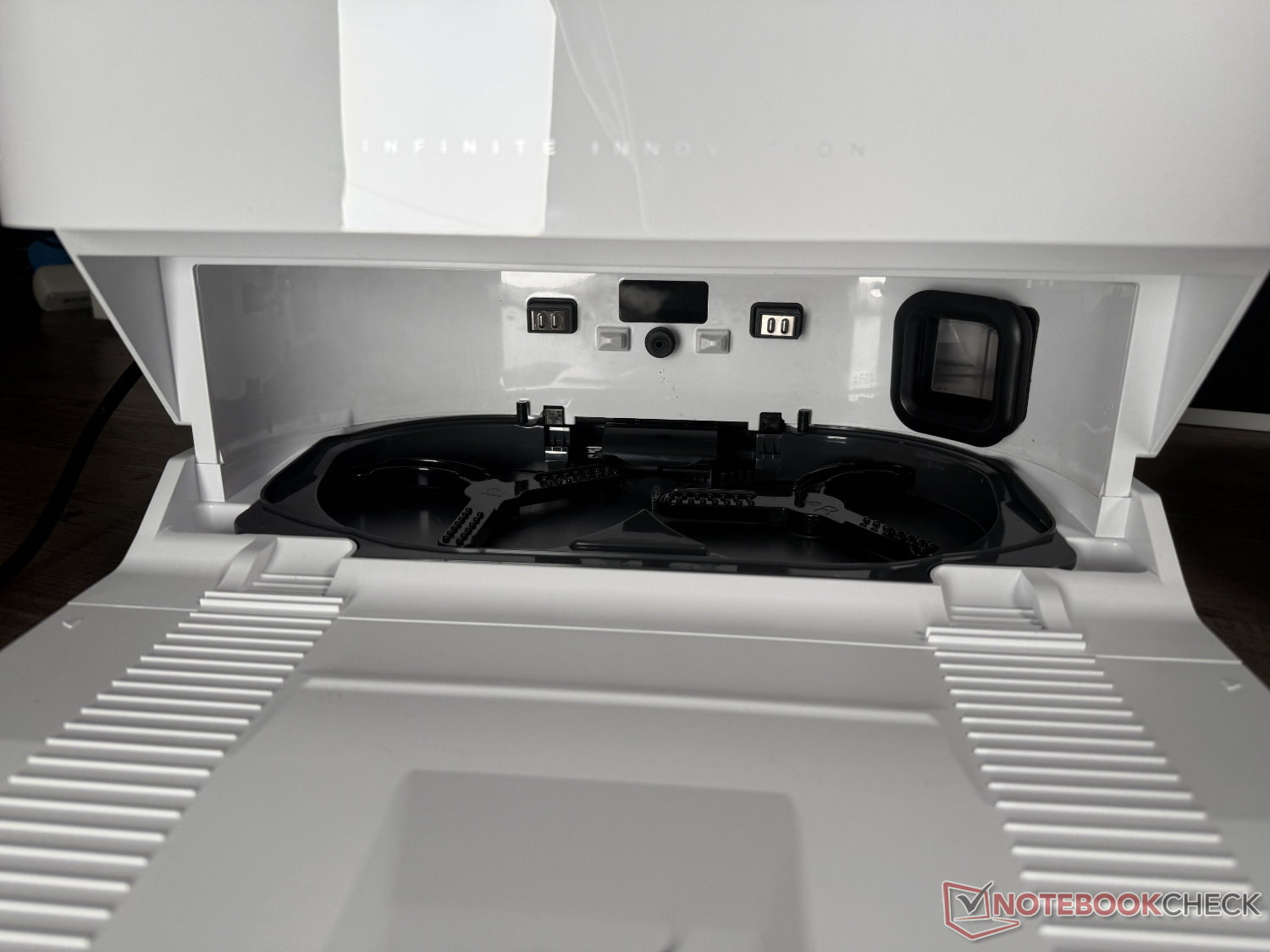 Geliefert wird der Eureka J15 Max Ultra mit einer Reinigungsstation, die sich selbst reinigt. Dazu kommen - abgesehen von der fehlenden automatischen Reinigungsmitteldosierung - die übliche Reinigung der Mopps mit hier 80°C heißem Wasser sowie die anschließende Trocknung mit 55°C erwärmter Luft. Optisch präsentiert sich die Basis in einem recht schlichten und gefälligen Design. Was die Optik in unseren Augen etwas trübt: In der weißen Ausführung ist ein schwarzes Stromkabel verbaut.