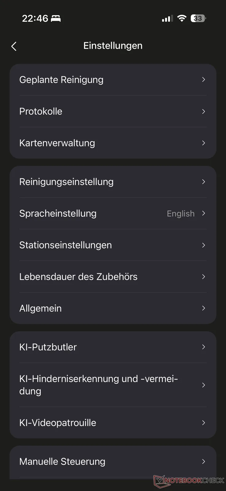 Dazu erscheinen über das Menü oben rechts zahlreiche Einstellungs-Optionen. Neben Reinigungsplanung und -protokollen gibt es hier die üblichen und wichtigen Anpassungsmöglichkeiten rund um die Reinigung (samt individueller Festlegung für einzelne Teppiche), die KI-Hinderniserkennung, die Station und mehr. Irritiert hat uns, dass der Zugriff auf die Live-Videoübertragung ohne vorherige Aktivierung samt Sicherheitscode funktioniert hat. Zudem haben wir eine Sprachsteuerung vermisst. Es gibt nur eine deutsche Sprachausgabe.