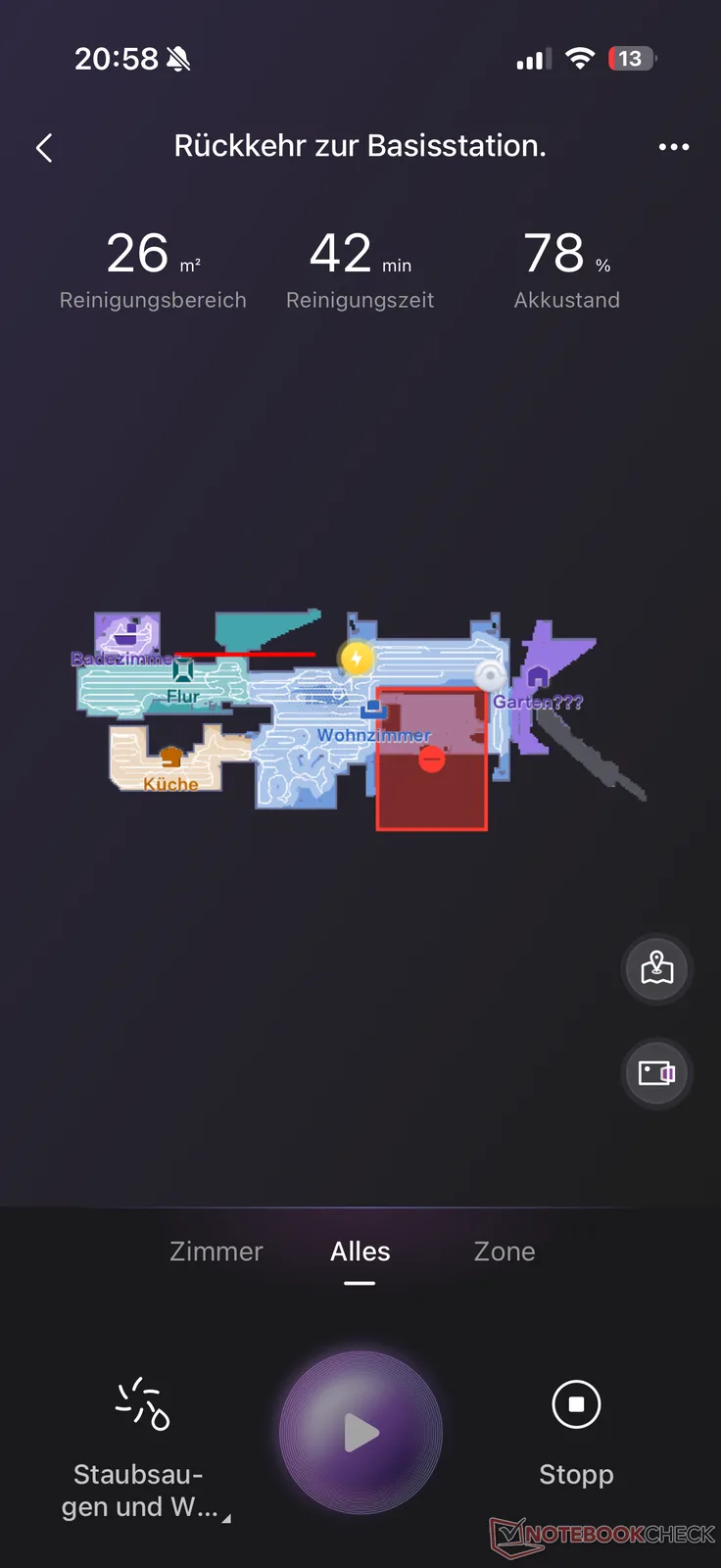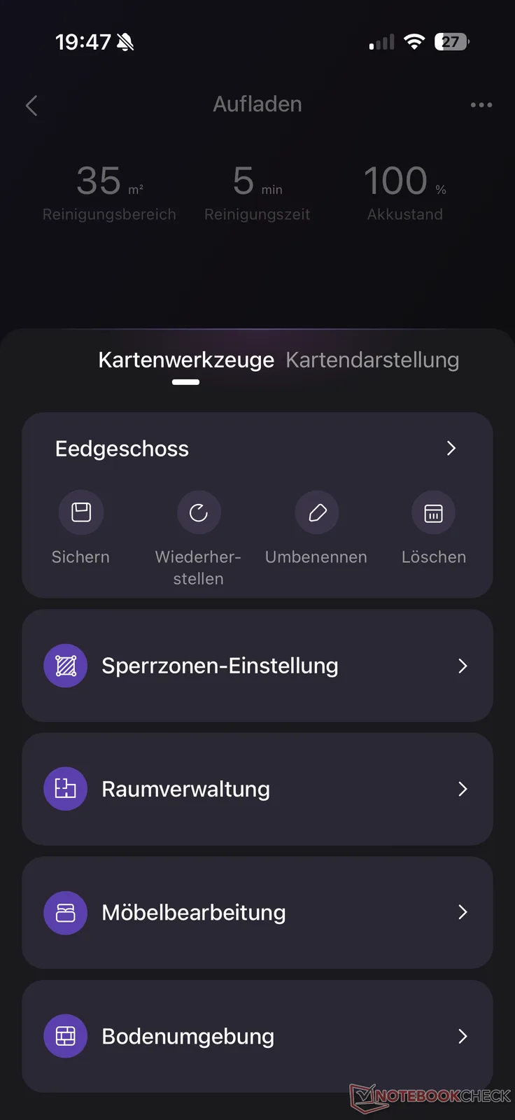 Anschließend folgt die für alle Saugroboter übliche Kartierungsfahrt. Hier legt der J15 Max Ultra binnen weniger Minuten eine virtuelle Map seines "neuen Reviers" an. Die automatische Raumaufteilung hat nicht sonderlich exakt funktioniert. Unter anderem wurde durch ein per Rollladen verschlossenes Fenster anhand der Spiegelung ein weiterer Raum dahinter vermutet. Die Ungenauigkeiten lassen sich aber größtenteils über die Kartenverwaltung an die wahren Gegebenheiten anpassen, einschließlich Sperrzonen, Schwellen, Bodenbelag und Möbeln. Insgesamt hat uns die Kartenanpassung bei dem einen oder anderen Hersteller aber besser gefallen, auch dank teils recht langer Ladezeiten der App.