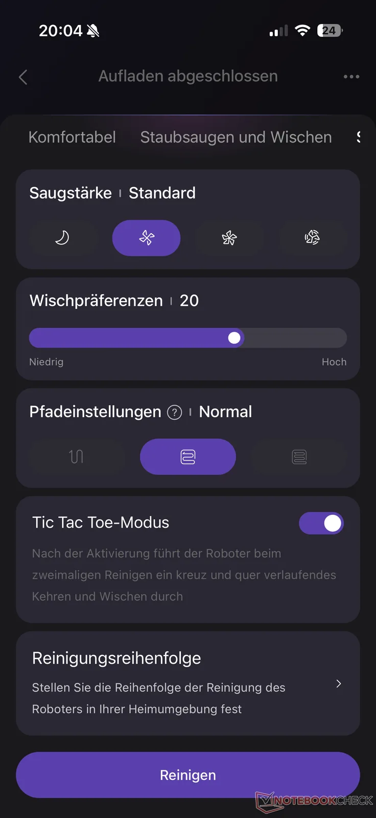 Bei den zur Verfügung stehenden Reinigungseinstellungen steht Eureka den Marktführern hingegen in nichts nach. Neben den vier üblichen Modi "Staubsaugen und Wischen", "Staubsaugen und dann Wischen", "Wischen" und "Staubsaugen" für Komplettreinigung, Zimmer und Zonen gibt es auch die Möglichkeit der individuellen Festlegung je Raum sowie einen KI-Modus mit automatischer Anpassung. Die Reinigungsleistung lässt sich beim Saugen in vier Stärken (Leise, Standard, Turbo, Max), die Wischfeuchtigkeit in 30 Stufen und die Pfadeinstellung in drei Optionen (Grob, Normal, Fein) anpassen. Dazu ist die Reinigungsreihenfolge festlegbar. Alles Standard für Modelle der gehobenen Preisklasse, aber wichtig.