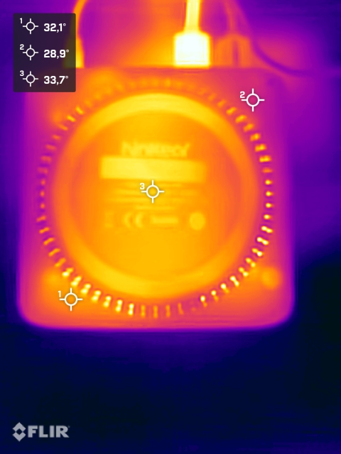 Dank seiner durchdachten Bauweise bleibt das Gehäuse des Ninkear M8 auch unter Last überwiegend kühl. Lediglich im Bereich der hinteren Belüftungsöffnungen lässt sich eine spürbare Erwärmung feststellen. Im Stresstest erreicht der AMD Ryzen 7 8745HS kurzfristig Temperaturen von etwa 94 °C, was noch unkritisch ist. Die durchschnittliche Leistungsaufnahme der APU liegt dabei bei rund 35 Watt. Im Leerlauf zeigt sich der Ninkear M8 sehr energieeffizient, unter Last liegt die durchschnittliche Leistungsaufnahme bei etwa 60 Watt, mit Spitzenwerten von bis zu 78 Watt. Im Hinblick auf Energieeffizienz schneidet der Mini-PC aufgrund der geringen Power-Limits des Prozessors hervorragend ab. Das mitgelieferte 120-Watt-Netzteil ist dabei leistungsmäßig gut abgestimmt.